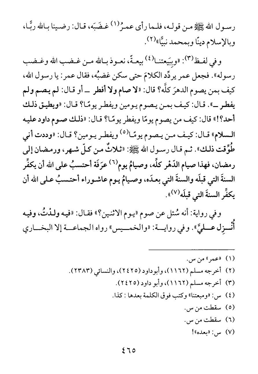 وفي لفظ (¬٣): «وبِبَيعتنا (¬٤) بيعةً، نعوذ بالله من غضب الله وغضب رسوله». فجعل عمر يردِّد الكلامَ حتى سكن غضبُه، فقال عمر: يا رسول الله، كيف بمن يصوم الدهرَ كلَّه؟ قال: «لا صام ولا أفطر ــ أو قال: لم يصم ولم يفطر ــ». قال: كيف بمن يصوم يومين ويفطر يومًا؟ قال: «ويطيق ذلك أحد؟!» قال: كيف من يصوم يومًا ويفطر يومًا؟ قال: «ذلك صوم داود عليه السلام» قال: كيف من يصوم يومًا (¬٥) ويفطر يومين؟ قال: «وددت أني طُوِّقت ذلك». ثم قال رسول الله - صلى الله عليه وسلم -: «ثلاثٌ من كلّ شهر، ورمضان إلى رمضان، فهذا صيام الدّهْر كلِّه، وصيامُ يوم (¬٦) عرَفَة أحتسبُ على الله أن يكفِّر السنةَ التي قبلَه والسنةَ التي بعدَه، وصيامُ يوم عاشوراء أحتسبُ على الله أن يكفِّر السنةَ التي قبلَه (¬٧)».