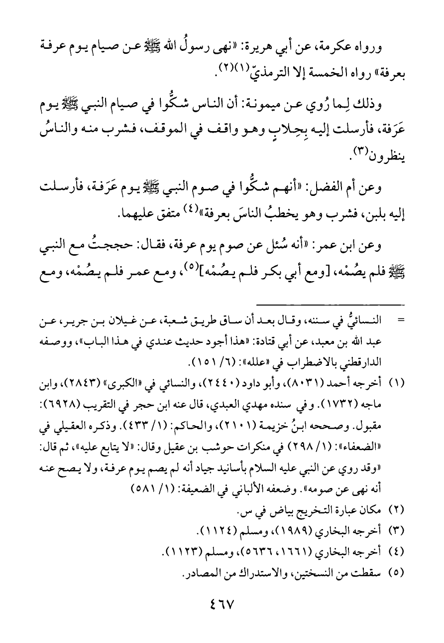 ورواه عكرمة، عن أبي هريرة: «نهى رسولُ الله - صلى الله عليه وسلم - عن صيام يوم عرفة بعرفة» رواه الخمسة إلا الترمذيّ (¬١) (¬٢).