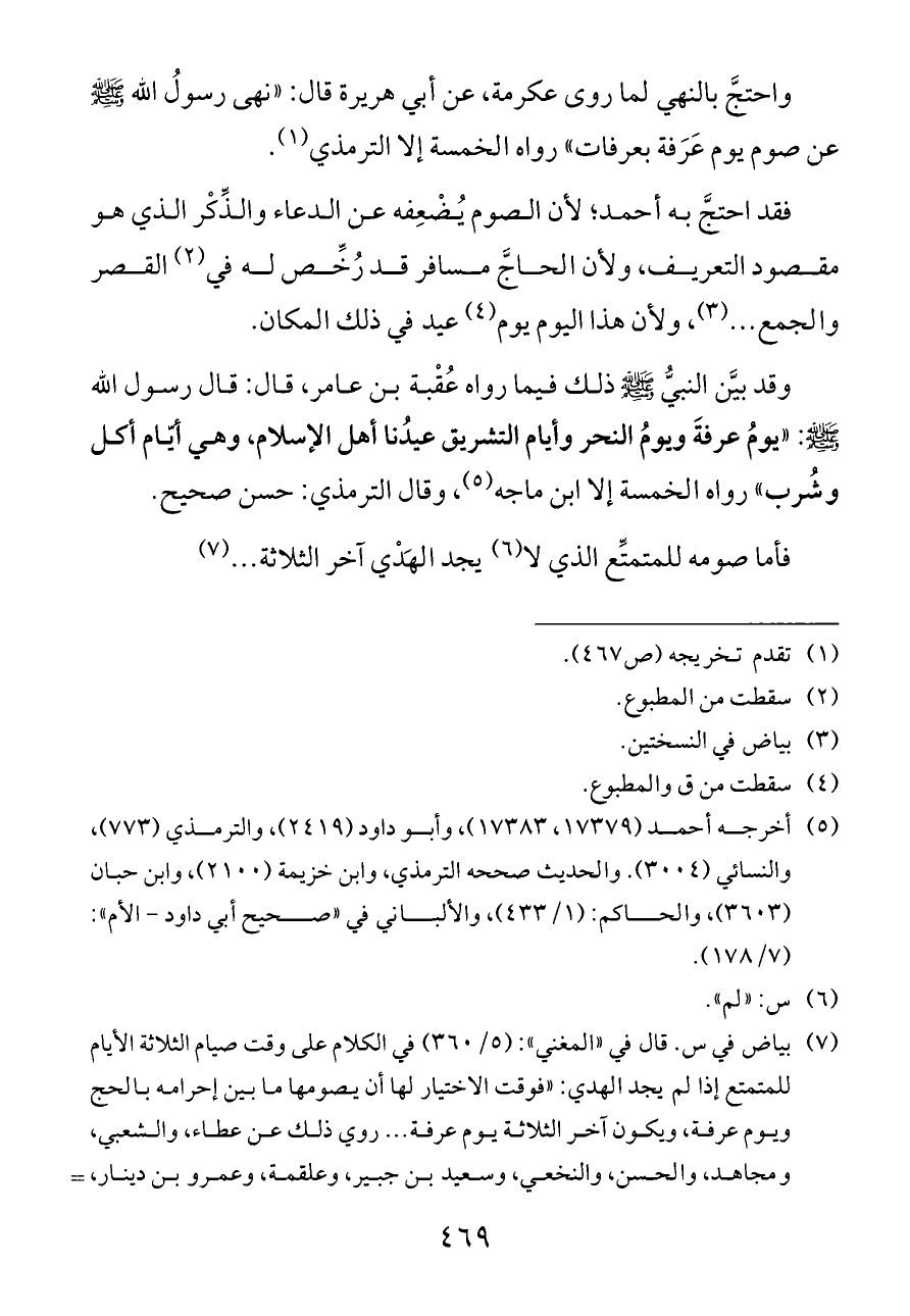 فقد احتجَّ به أحمد؛ لأن الصوم يُضْعِفه عن الدعاء والذِّكْر الذي هو مقصود التعريف، ولأن الحاجَّ مسافر قد رُخِّص له في (¬٢) القصر والجمع ... (¬٣)، ولأن هذا اليوم يوم (¬٤) عيد في ذلك المكان.