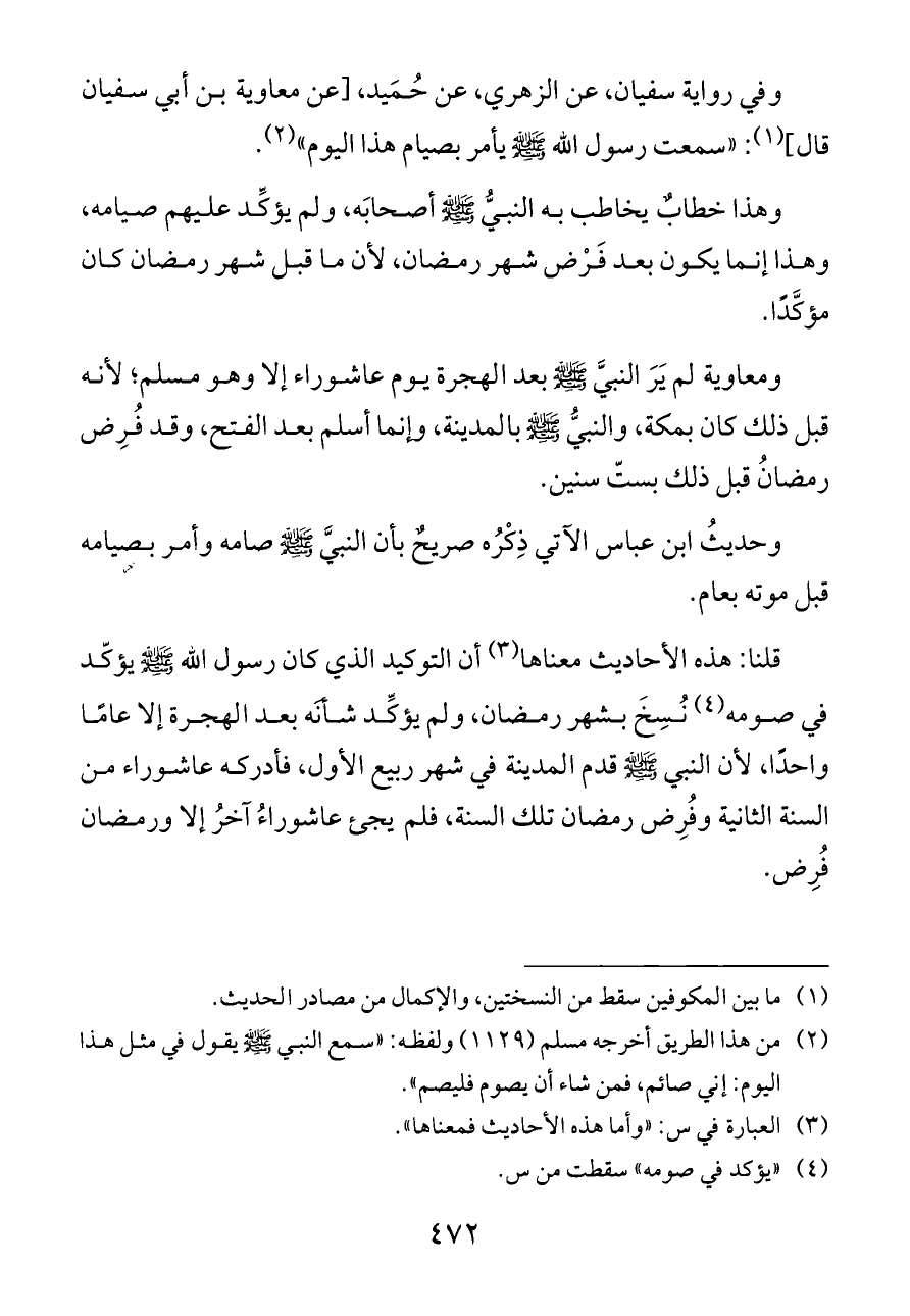 ومعاوية لم يَرَ النبيَّ - صلى الله عليه وسلم - بعد الهجرة يوم عاشوراء إلا وهو مسلم؛ لأنه قبل ذلك كان بمكة، والنبيُّ - صلى الله عليه وسلم - بالمدينة، وإنما أسلم بعد الفتح، وقد فُرِض رمضانُ قبل ذلك بستّ سنين.