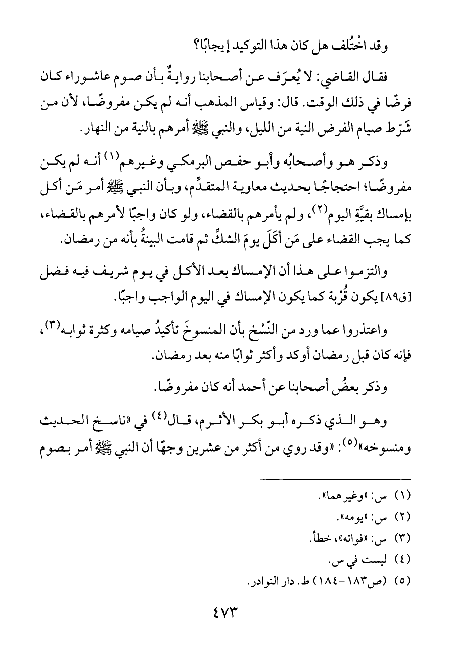 وذكر هو وأصحابُه وأبو حفص البرمكي وغيرهم (¬١) أنه لم يكن مفروضًا؛ احتجاجًا بحديث معاوية المتقدِّم، وبأن النبي - صلى الله عليه وسلم - أمر مَن أكل بإمساك بقيَّةِ اليوم (¬٢)، ولم يأمرهم بالقضاء، ولو كان واجبًا لأمرهم بالقضاء، كما يجب القضاء على مَن أكَلَ يومَ الشكِّ ثم قامت البينةُ بأنه من رمضان.