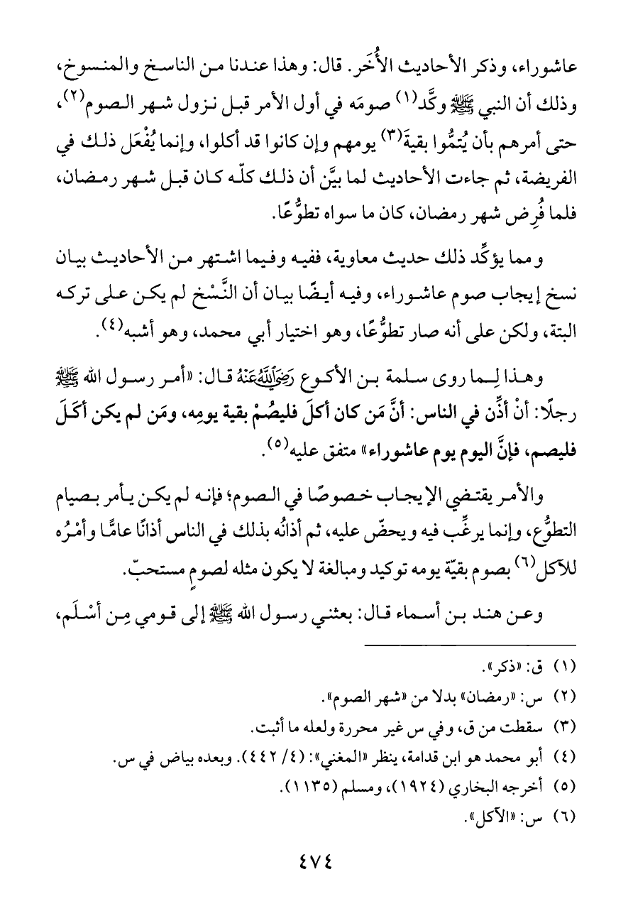 ومما يؤكِّد ذلك حديث معاوية، ففيه وفيما اشتهر من الأحاديث بيان نسخ إيجاب صوم عاشوراء، وفيه أيضًا بيان أن النَّسْخ لم يكن على تركه البتة، ولكن على أنه صار تطوُّعًا، وهو اختيار أبي محمد، وهو أشبه (¬٤).