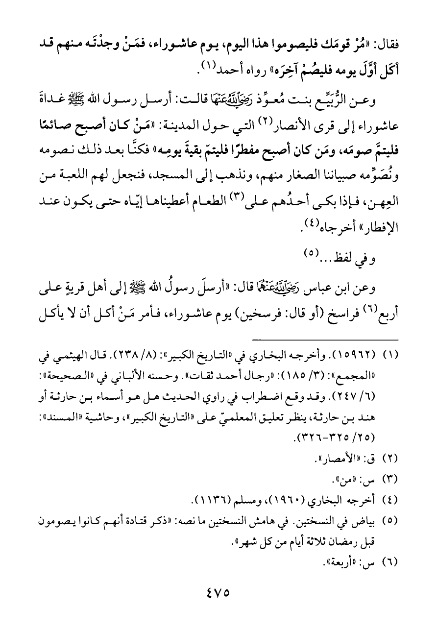 وعن ابن عباس - رضي الله عنهما - قال: «أرسلَ رسولُ الله - صلى الله عليه وسلم - إلى أهل قريةٍ على أربع (¬٦) فراسخ (أو قال: فرسخين) يوم عاشوراء، فأمر مَنْ أكل أن لا يأكل