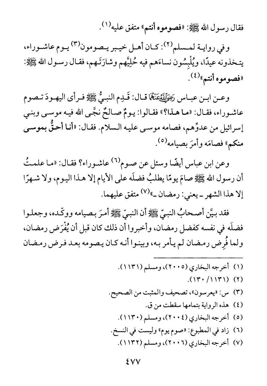 وفي رواية لمسلم (¬٢): كان أهل خيبر يصومون (¬٣) يوم عاشوراء، يتخذونه عيدًا، ويُلْبِسُون نساءَهم فيه حُلِيَّهم وشارَتَهم، فقال رسول الله - صلى الله عليه وسلم -: «فصوموه أنتم» (¬٤).