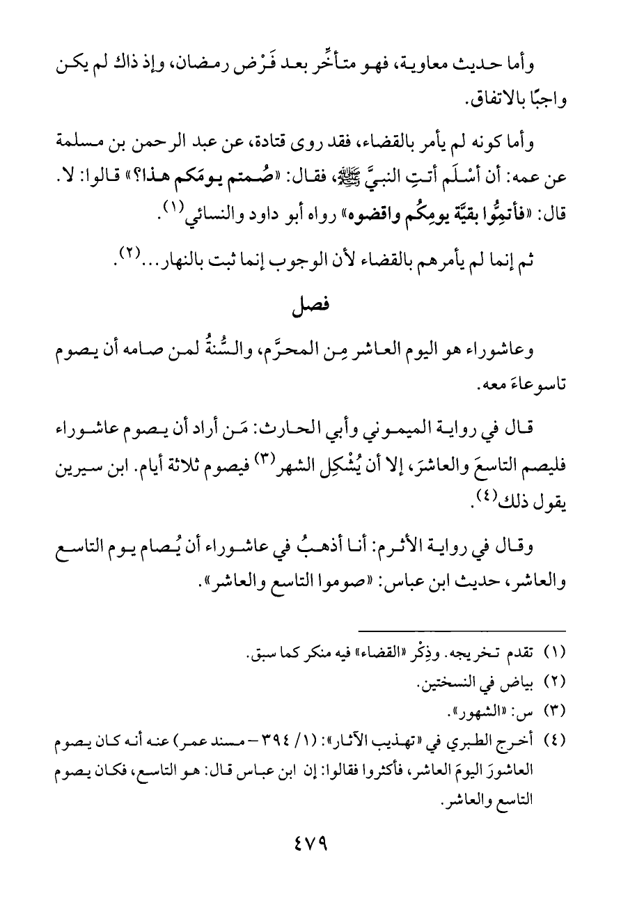 وأما كونه لم يأمر بالقضاء، فقد روى قتادة، عن عبد الرحمن بن مسلمة عن عمه: أن أسْلَم أتتِ النبيَّ - صلى الله عليه وسلم -، فقال: «صُمتم يومَكم هذا؟» قالوا: لا. قال: «فأتِمُّوا بقيَّة يومِكُم واقضوه» رواه أبو داود والنسائي (¬١).