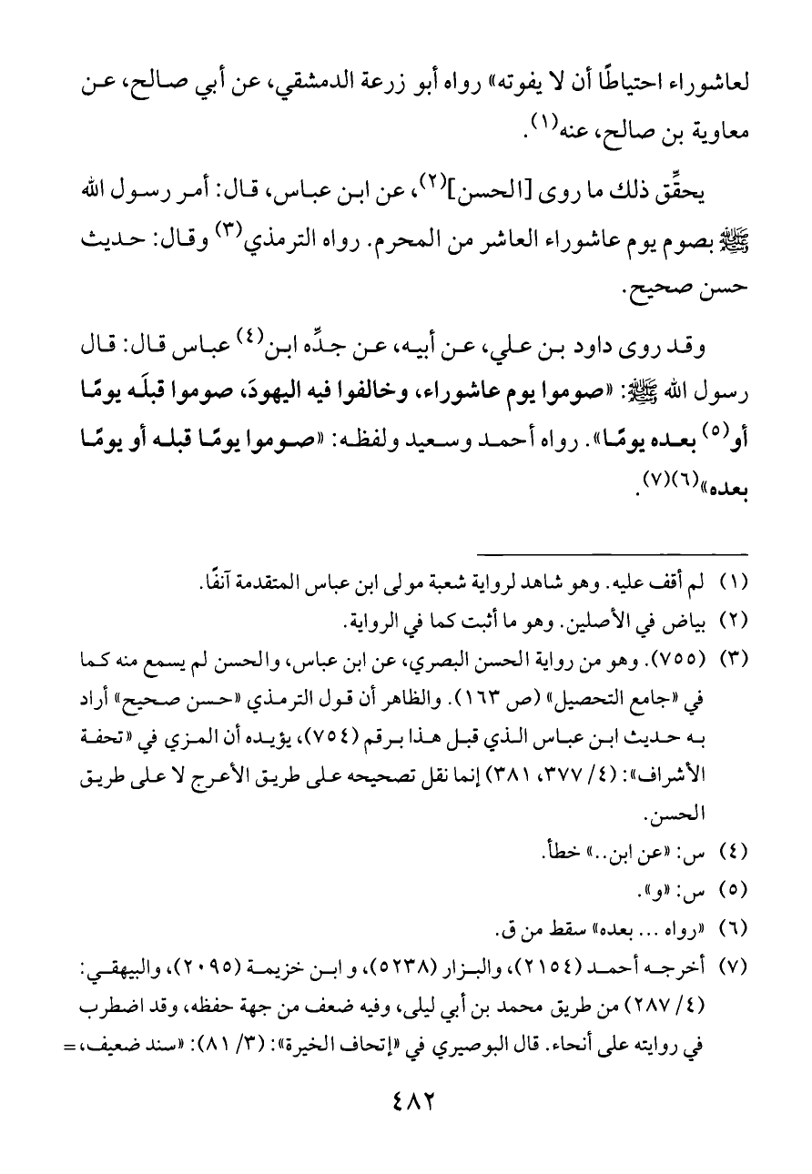 وقد روى داود بن علي، عن أبيه، عن جدِّه ابن (¬٤) عباس قال: قال رسول الله - صلى الله عليه وسلم -: «صوموا يوم عاشوراء، وخالفوا فيه اليهودَ، صوموا قبلَه يومًا أو (¬٥) بعده يومًا». رواه أحمد وسعيد ولفظه: «صوموا يومًا قبله أو يومًا بعده» (¬٦) (¬٧).