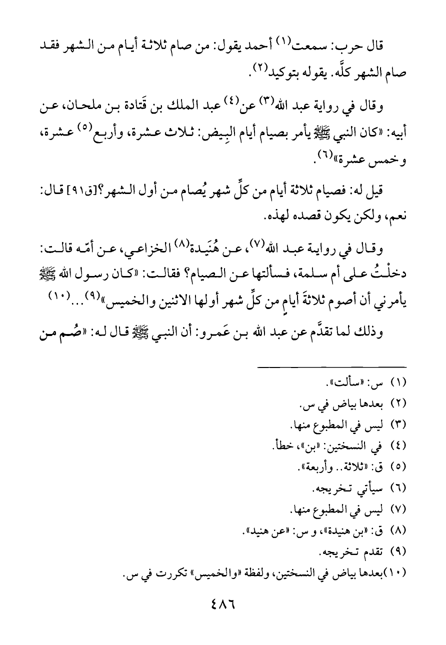 وقال في رواية عبد الله (¬٣) عن (¬٤) عبد الملك بن قَتادة بن ملحان، عن أبيه: «كان النبي - صلى الله عليه وسلم - يأمر بصيام أيام البِيض: ثلاث عشرة، وأربع (¬٥) عشرة، وخمس عشرة» (¬٦).