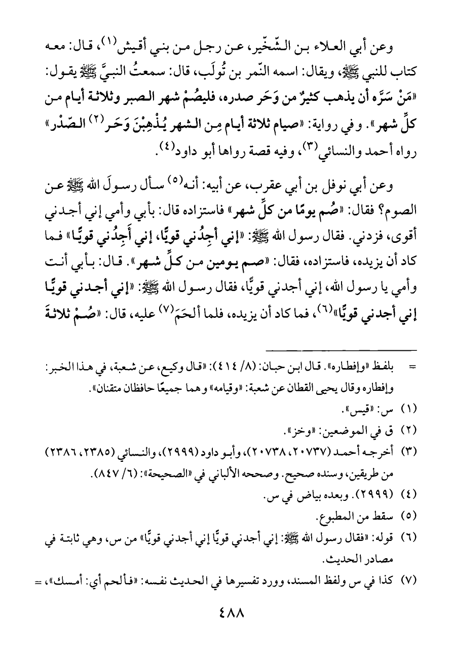 وعن أبي العلاء بن الشّخّير، عن رجل من بني أقيش (¬١)، قال: معه كتاب للنبي - صلى الله عليه وسلم -، ويقال: اسمه النّمر بن تُولَب، قال: سمعتُ النبيَّ - صلى الله عليه وسلم - يقول: «مَنْ سَرَّه أن يذهب كثيرٌ من وَحَر صدره، فليصُمْ شهر الصبر وثلاثة أيام من كلِّ شهر». وفي رواية: «صيام ثلاثة أيام مِن الشهر يُذْهِبْنَ وَحَر (¬٢) الصّدْر» رواه أحمد والنسائي (¬٣)، وفيه قصة رواها أبو داود (¬٤).