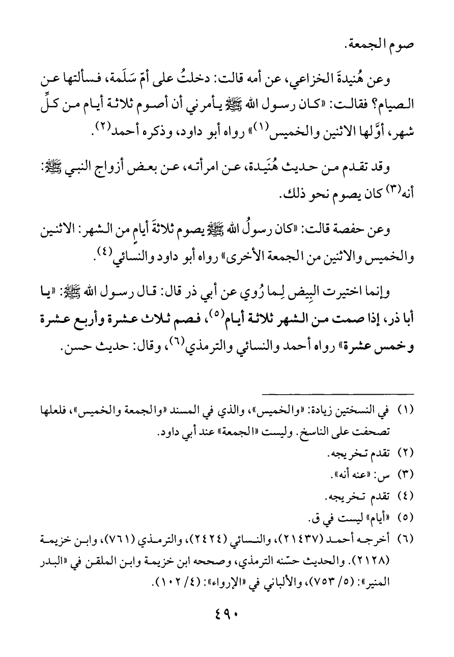 وعن هُنيدةَ الخزاعي، عن أمه قالت: دخلتُ على أمّ سَلَمة، فسألتها عن الصيام؟ فقالت: «كان رسول الله - صلى الله عليه وسلم - يأمرني أن أصوم ثلاثة أيام من كلِّ شهر، أوَّلها الاثنين والخميس (¬١)» رواه أبو داود، وذكره أحمد (¬٢).