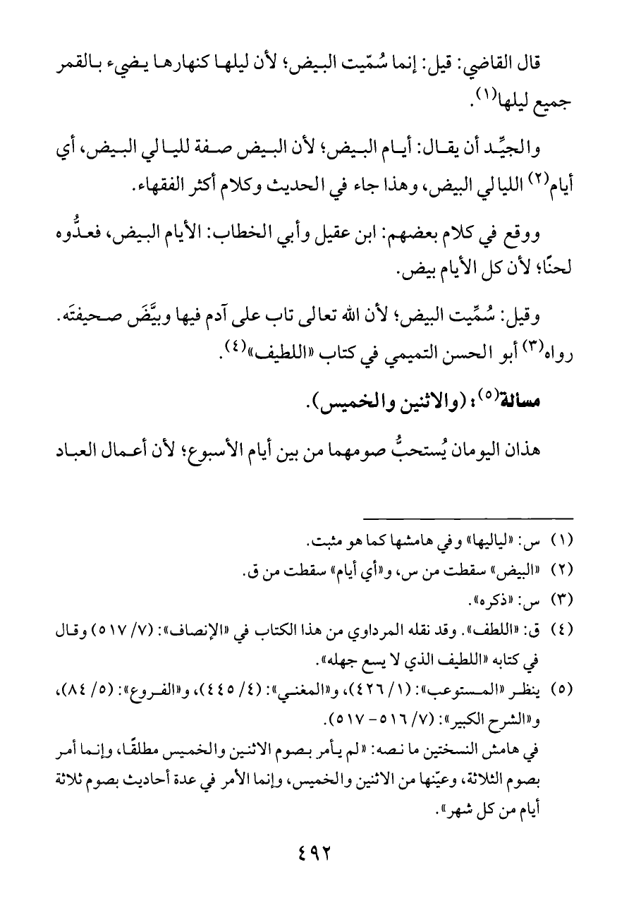 والجيِّد أن يقال: أيام البيض؛ لأن البيض صفة لليالي البيض، أي أيام (¬٢) الليالي البيض، وهذا جاء في الحديث وكلام أكثر الفقهاء.