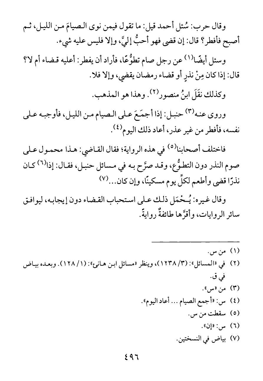 وقال حرب: سُئل أحمد قيل: ما تقول فيمن نوى الصيامَ من الليل، ثم أصبح فأفطر؟ قال: إن قضى فهو أحبُّ إليَّ، وإلا فليس عليه شيء.