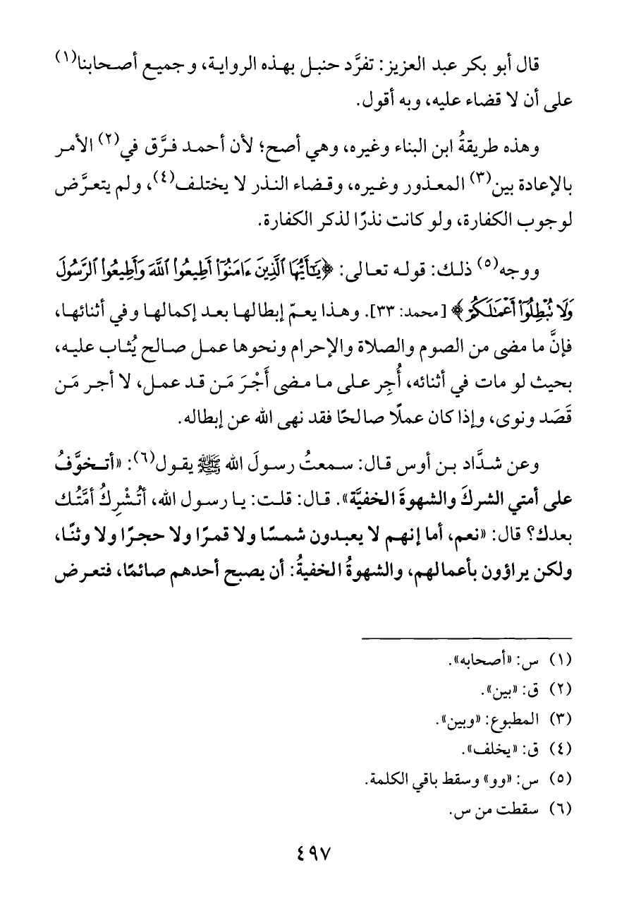 ووجه (¬٥) ذلك: قوله تعالى: {يَاأَيُّهَا الَّذِينَ آمَنُوا أَطِيعُوا اللَّهَ وَأَطِيعُوا الرَّسُولَ وَلَا تُبْطِلُوا أَعْمَالَكُمْ} [محمد: ٣٣]. وهذا يعمّ إبطالها بعد إكمالها وفي أثنائها، فإنَّ ما مضى من الصوم والصلاة والإحرام ونحوها عمل صالح يُثاب عليه، بحيث لو مات في أثنائه، أُجِر على ما مضى أَجْرَ مَن قد عمل، لا أجر مَن قَصَد ونوى، وإذا كان عملًا صالحًا فقد نهى الله عن إبطاله.