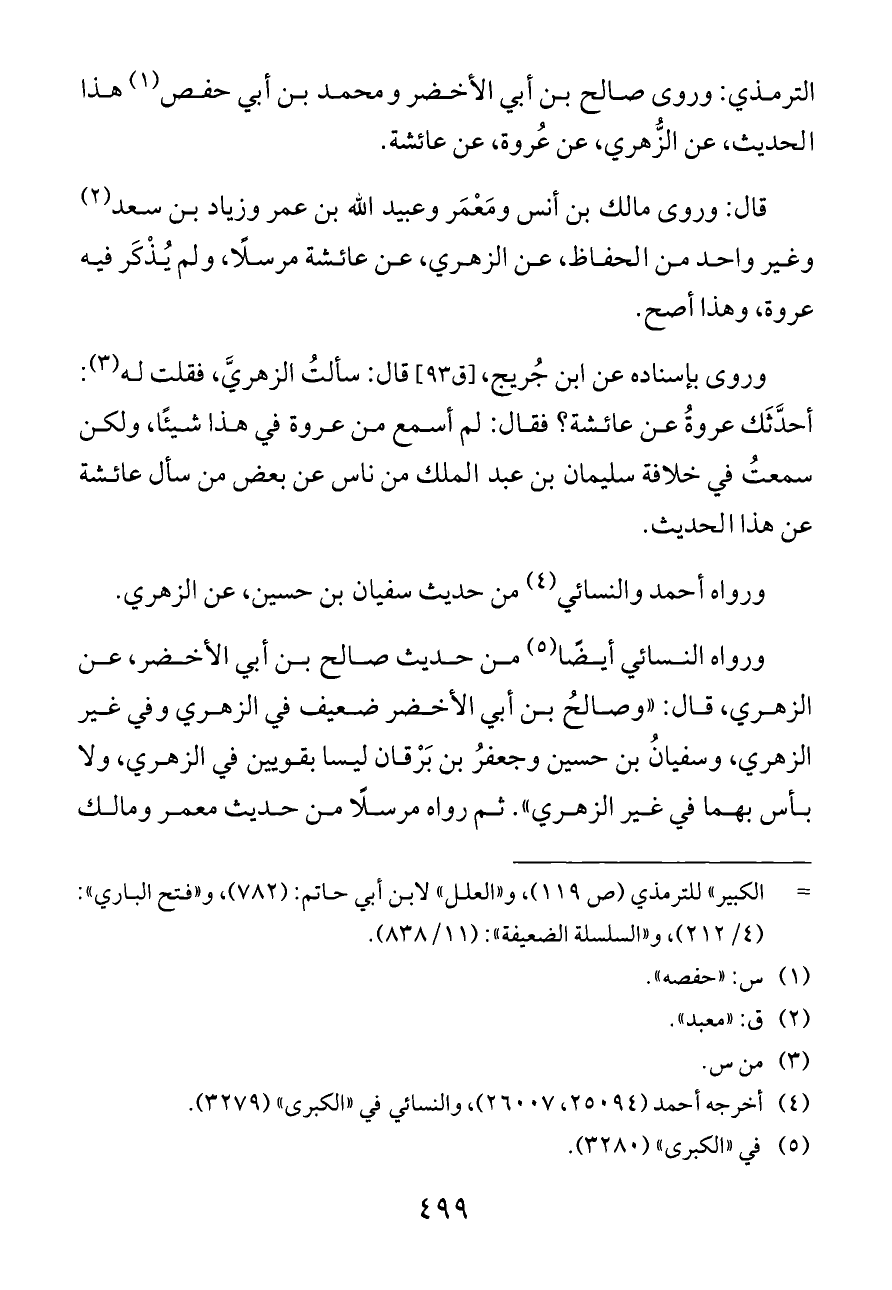 ورواه النسائي أيضًا (¬٥) من حديث صالح بن أبي الأخضر، عن الزهري، قال: «وصالحُ بن أبي الأخضر ضعيف في الزهري وفي غير الزهري، وسفيانُ بن حسين وجعفرُ بن بَرْقان ليسا بقويين في الزهري، ولا بأس بهما في غير الزهري». ثم رواه مرسلًا من حديث معمر ومالك
