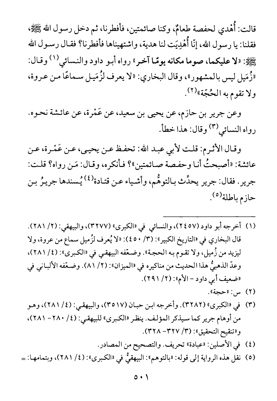 (¬١) أخرجه أبو داود (٢٤٥٧)، والنسائي في «الكبرى» (٣٢٧٧)، والبيهقي: (٢/ ٢٨١). قال البخاري في «التاريخ الكبير»: (٣/ ٤٥٠): «لا يُعرف لزُميل سماع من عروة، ولا ليزيد من زُميل، ولا تقوم به الحجة». وضعّفه البيهقي في «الكبرى»: (٤/ ٢٨١)، وعدّ الذهبيُّ هذا الحديث من مناكيره في «الميزان»: (٢/ ٨١). وضعّفه الألباني في «ضعيف أبي داود - الأم»: (٢/ ٢٩١).