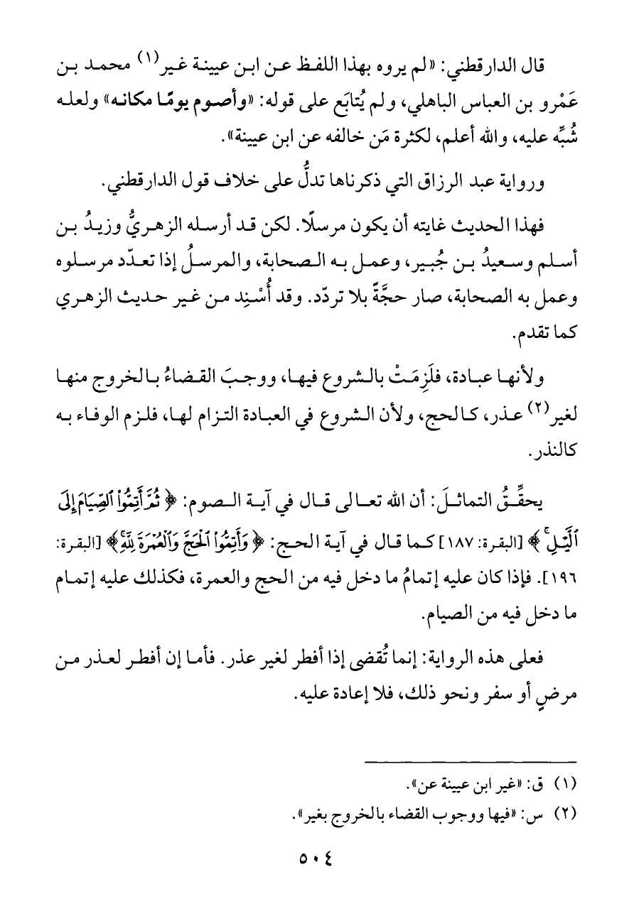 قال الدارقطني: «لم يروه بهذا اللفظ عن ابن عيينة غير (¬١) محمد بن عَمْرو بن العباس الباهلي، ولم يُتابَع على قوله: «وأصوم يومًا مكانه» ولعله شُبِّه عليه، والله أعلم، لكثرة مَن خالفه عن ابن عيينة».