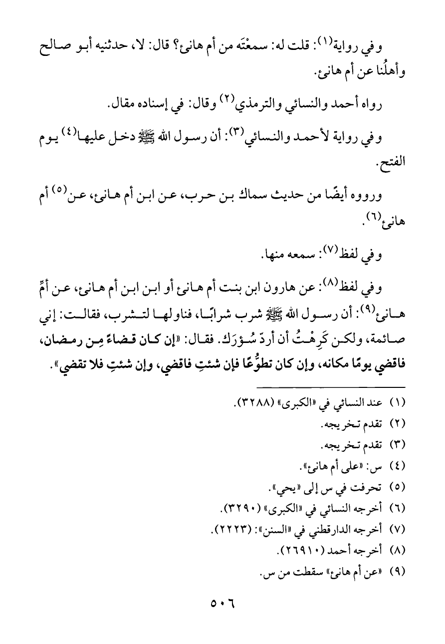 وفي لفظ (¬٨): عن هارون ابن بنت أم هانئ أو ابن ابن أم هانئ، عن أمِّ هانئ (¬٩): أن رسول الله - صلى الله عليه وسلم - شرب شرابًا، فناولها لتشرب، فقالت: إني صائمة، ولكن كَرِهْتُ أن أردّ سُؤرَك. فقال: «إن كان قضاءً مِن رمضان، فاقضي يومًا مكانه، وإن كان تطوُّعًا فإن شئتِ فاقضي، وإن شئتِ فلا تقضي».