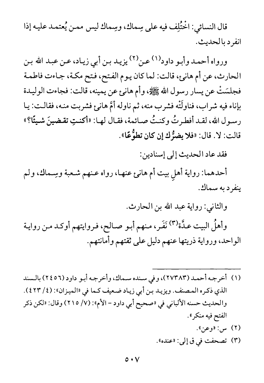 أحدهما: رواية أهلِ بيت أم هانئ عنها، رواه عنهم شعبة وسِماك، ولم ينفرد به سماك.