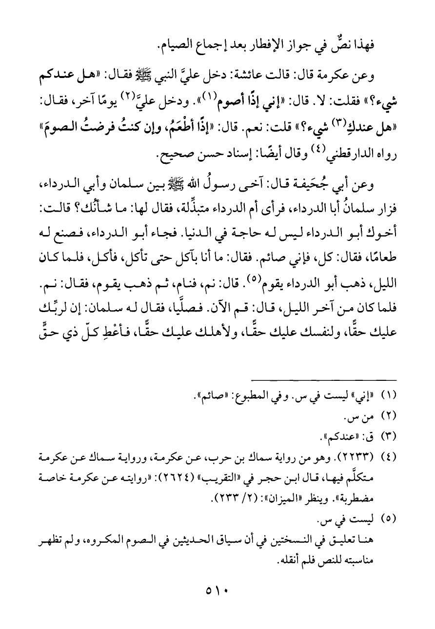 هنا تعليق في النسختين في أن سياق الحديثين في الصوم المكروه، ولم تظهر مناسبته للنص فلم أنقله.