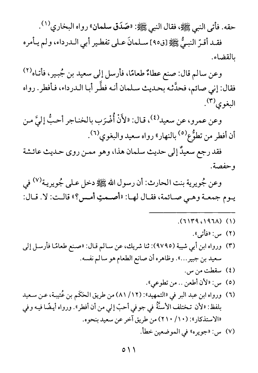 وعن سالم قال: صنع عطاءٌ طعامًا، فأرسل إلى سعيد بن جُبير، فأتاه (¬٢) فقال: إني صائم، فحدَّثه بحديث سلمان أنه فطَّر أبا الدرداء، فأفطر. رواه البغوي (¬٣).