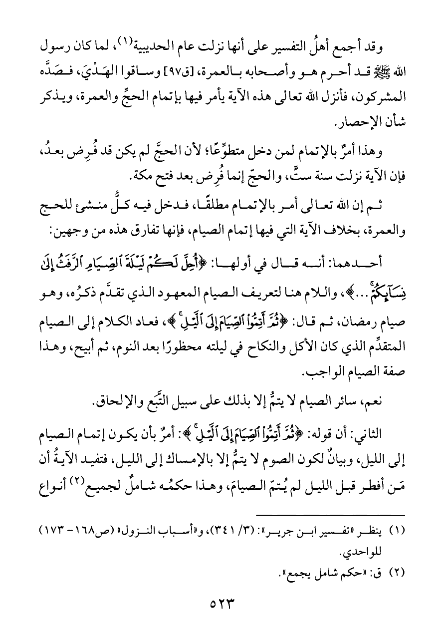 ثم إن الله تعالى أمر بالإتمام مطلقًا، فدخل فيه كلُّ منشئ للحج والعمرة، بخلاف الآية التي فيها إتمام الصيام، فإنها تفارق هذه من وجهين: