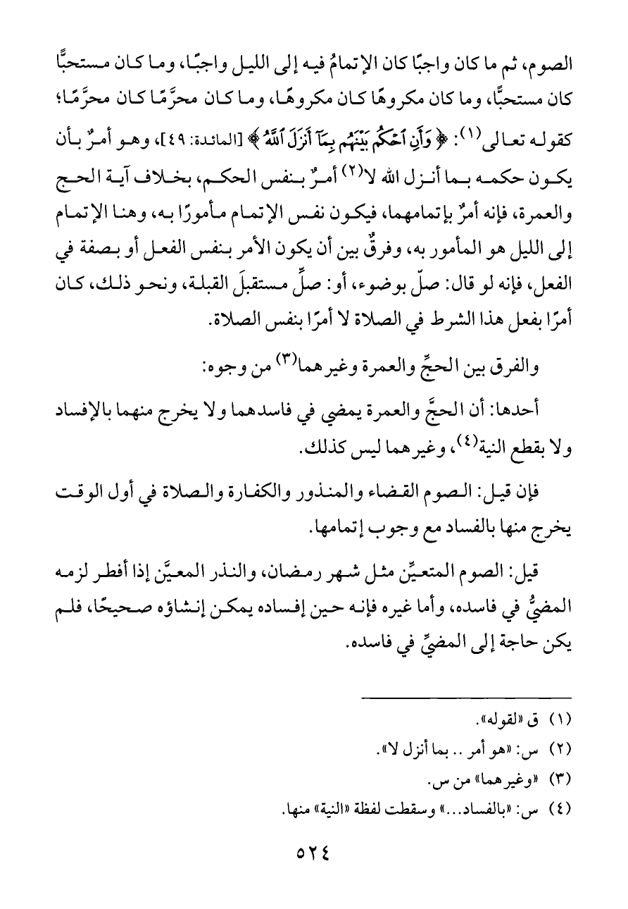 الصوم، ثم ما كان واجبًا كان الإتمامُ فيه إلى الليل واجبًا، وما كان مستحبًّا كان مستحبًّا، وما كان مكروهًا كان مكروهًا، وما كان محرَّمًا كان محرَّمًا؛ كقوله تعالى (¬١): {وَأَنِ احْكُمْ بَيْنَهُمْ بِمَا أَنْزَلَ اللَّهُ} [المائدة: ٤٩]، وهو أمرٌ بأن يكون حكمه بما أنزل الله لا (¬٢) أمرٌ بنفس الحكم، بخلاف آية الحج والعمرة، فإنه أمرٌ بإتمامهما، فيكون نفس الإتمام مأمورًا به، وهنا الإتمام إلى الليل هو المأمور به، وفرقٌ بين أن يكون الأمر بنفس الفعل أو بصفة في الفعل، فإنه لو قال: صلّ بوضوء، أو: صلِّ مستقبلَ القبلة، ونحو ذلك، كان أمرًا بفعل هذا الشرط في الصلاة لا أمرًا بنفس الصلاة.