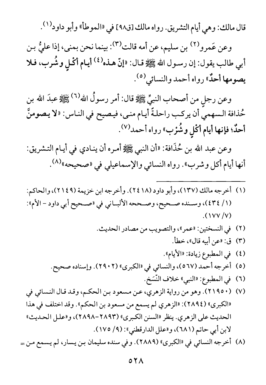 وعن عبد الله بن حُذَافة: «أن النبي - صلى الله عليه وسلم - أمره أن ينادي في أيام التشريق: أنها أيام أكل وشرب». رواه النسائي والإسماعيلي في «صحيحه» (¬٨).
