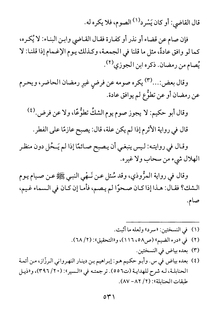 فإن صام عن قضاء أو نذر أو كفارة فقال القاضي وابن البناء: لا يُكره، كما لو وافق عادةً، مثل ما قلنا في الجمعة، وكذلك يوم الإغمام إذا قلنا: لا يُصام من رمضان. ذكره ابن الجوزي (¬٢).