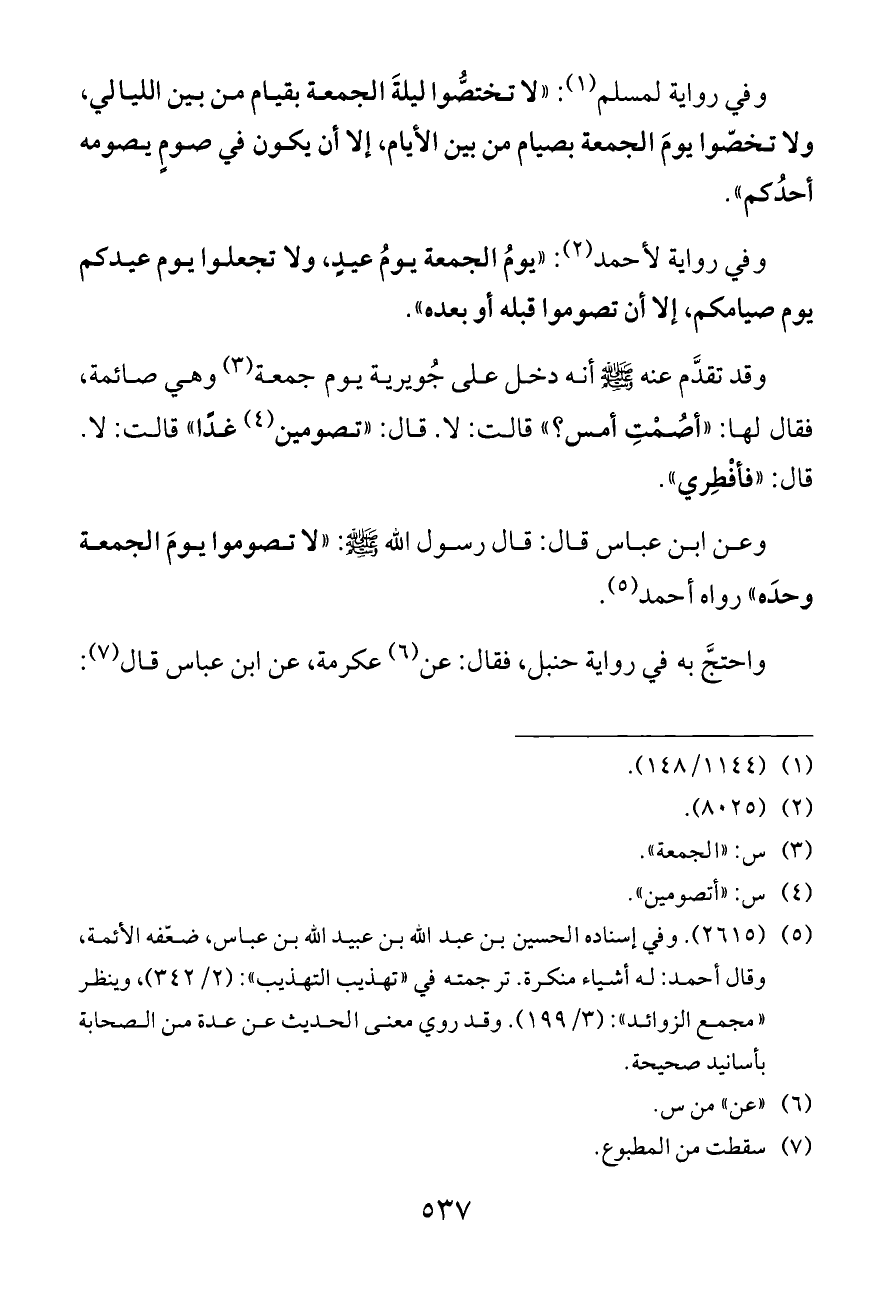 وعن ابن عباس قال: قال رسول الله - صلى الله عليه وسلم -: «لا تصوموا يومَ الجمعة وحدَه» رواه أحمد (¬٥).
