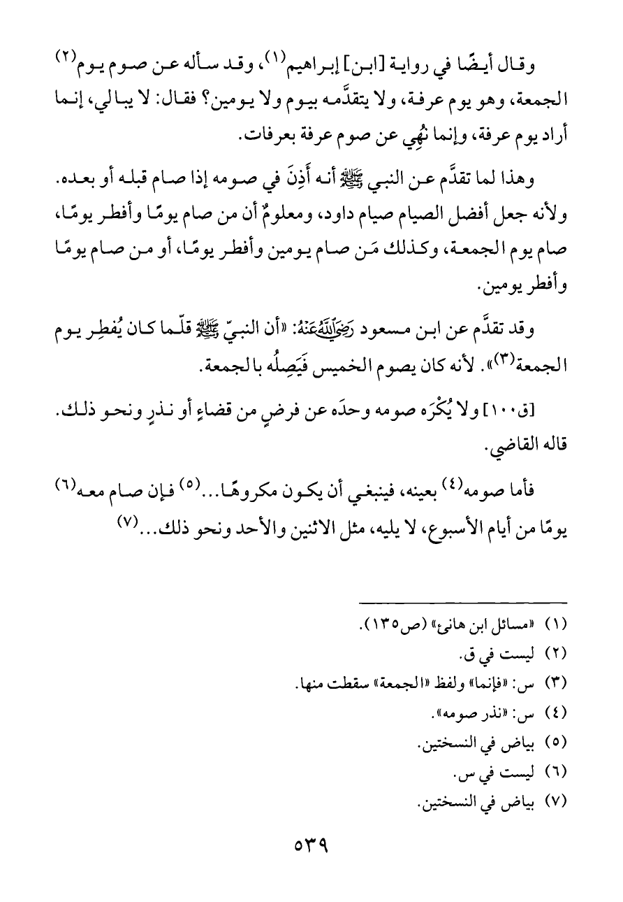 وقال أيضًا في رواية [ابن] إبراهيم (¬١)، وقد سأله عن صوم يوم (¬٢) الجمعة، وهو يوم عرفة، ولا يتقدَّمه بيوم ولا يومين؟ فقال: لا يبالي، إنما أراد يوم عرفة، وإنما نُهِي عن صوم عرفة بعرفات.