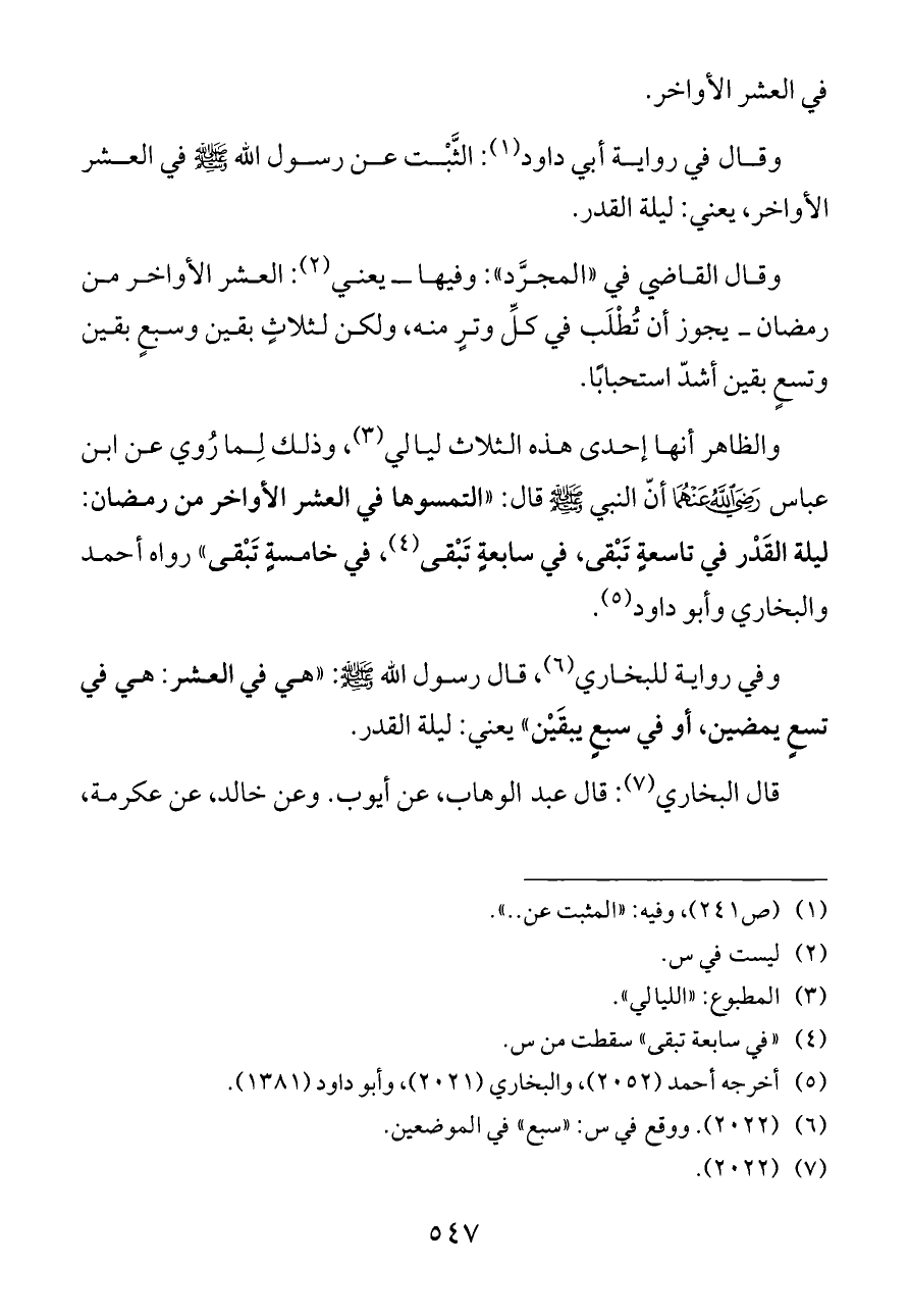 والظاهر أنها إحدى هذه الثلاث ليالي (¬٤)، وذلك لِما رُوي عن ابن عباس - رضي الله عنهما - أنّ النبي - صلى الله عليه وسلم - قال: «التمسوها في العشر الأواخر من رمضان: ليلة القَدْر في تاسعةٍ تَبْقى، في سابعةٍ تَبْقى (¬٥)، في خامسةٍ تَبْقى» رواه أحمد والبخاري وأبو داود (¬٦).