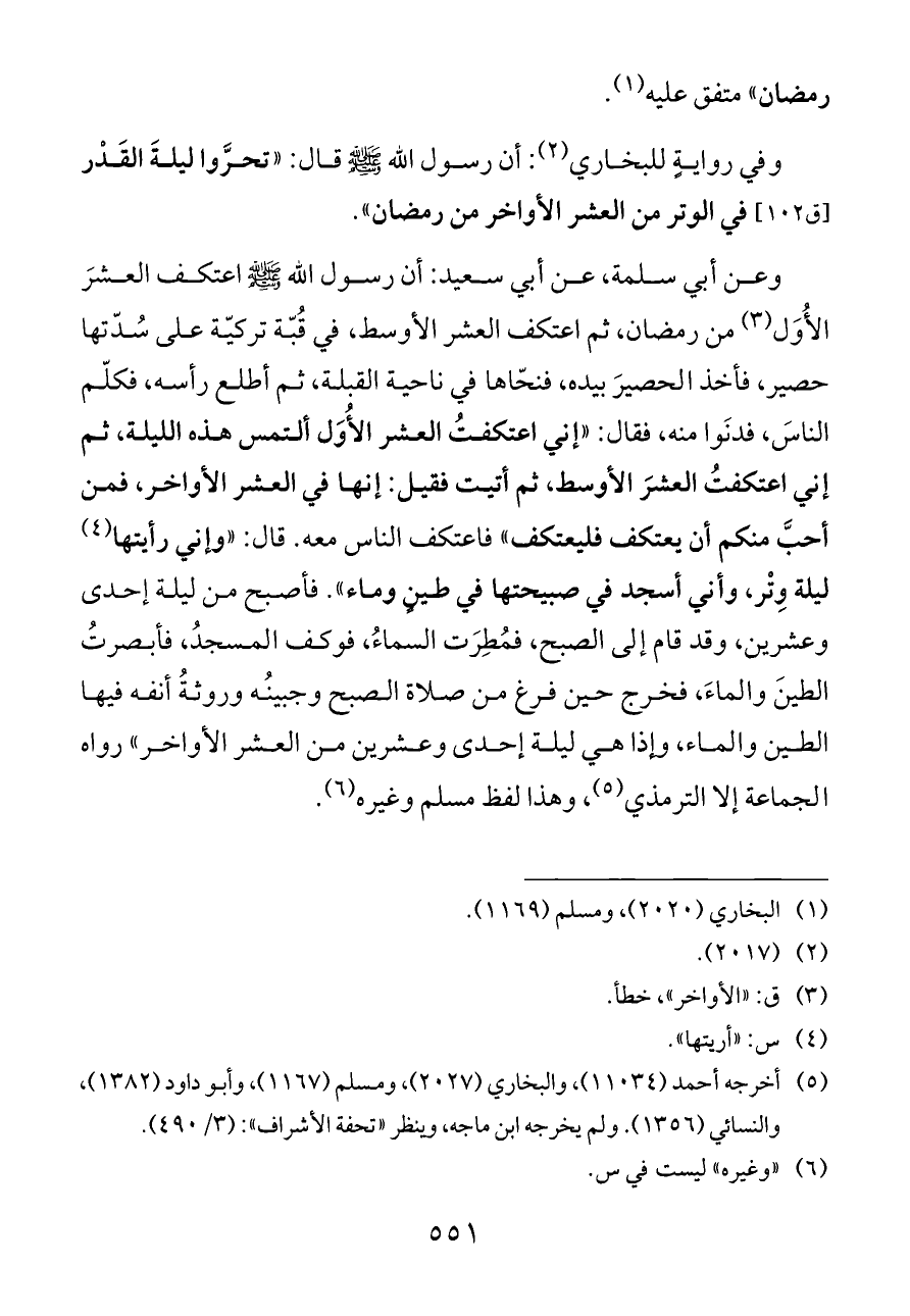 وعن أبي سلمة، عن أبي سعيد: أن رسول الله - صلى الله عليه وسلم - اعتكف العشرَ الأُوَل (¬٤) من رمضان، ثم اعتكف العشر الأوسط، في قُبّة تركيّة على سُدّتها حصير، فأخذ الحصيرَ بيده، فنحّاها في ناحية القبلة، ثم أطلع رأسه، فكلّم الناسَ، فدنَوا منه، فقال: «إني اعتكفتُ العشر الأُوَل ألتمس هذه الليلة، ثم إني اعتكفتُ العشرَ الأوسط، ثم أتيت فقيل: إنها في العشر الأواخر، فمن أحبَّ منكم أن يعتكف فليعتكف» فاعتكف الناس معه. قال: «وإني رأيتها (¬٥) ليلة وِتْر، وأني أسجد في صبيحتها في طينٍ وماء». فأصبح من ليلة إحدى وعشرين، وقد قام إلى الصبح، فمُطِرَت السماءُ، فوكف المسجدُ، فأبصرتُ الطينَ والماءَ، فخرج حين فرغ من صلاة الصبح وجبينُه وروثةُ أنفه فيها الطين والماء، وإذا هي ليلة إحدى وعشرين من العشر الأواخر» رواه الجماعة إلا الترمذي (¬٦)، وهذا لفظ مسلم وغيره (¬٧).