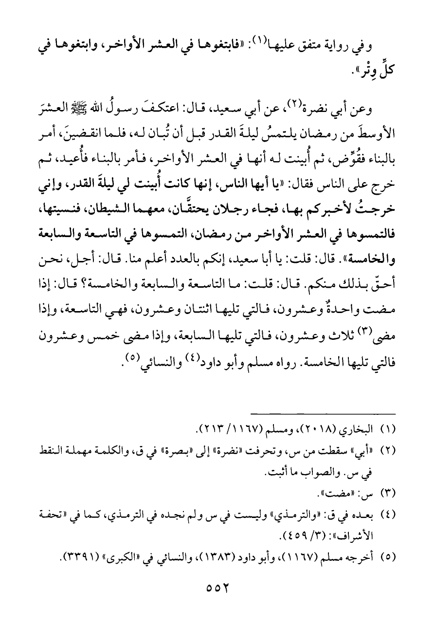 وعن أبي نضرة (¬٢)، عن أبي سعيد، قال: اعتكفَ رسولُ الله - صلى الله عليه وسلم - العشرَ الأوسطَ من رمضان يلتمسُ ليلةَ القدر قبل أن تُبان له، فلما انقضينَ، أمر بالبناء فقُوِّض، ثم أُبينت له أنها في العشر الأواخر، فأمر بالبناء فأُعيد، ثم خرج على الناس فقال: «يا أيها الناس، إنها كانت أُبينت لي ليلةَ القدر، وإني خرجتُ لأخبركم بها، فجاء رجلان يحتقَّان، معهما الشيطان، فنسيتها، فالتمسوها في العشر الأواخر من رمضان، التمسوها في التاسعة والسابعة والخامسة». قال: قلت: يا أبا سعيد، إنكم بالعدد أعلم منا. قال: أجل، نحن أحقّ بذلك منكم. قال: قلت: ما التاسعة والسابعة والخامسة؟ قال: إذا مضت واحدةٌ وعشرون، فالتي تليها اثنتان وعشرون، فهي التاسعة، وإذا مضى (¬٣) ثلاث وعشرون، فالتي تليها السابعة، وإذا مضى خمس وعشرون فالتي تليها الخامسة. رواه مسلم وأبو داود (¬٤) والنسائي (¬٥).