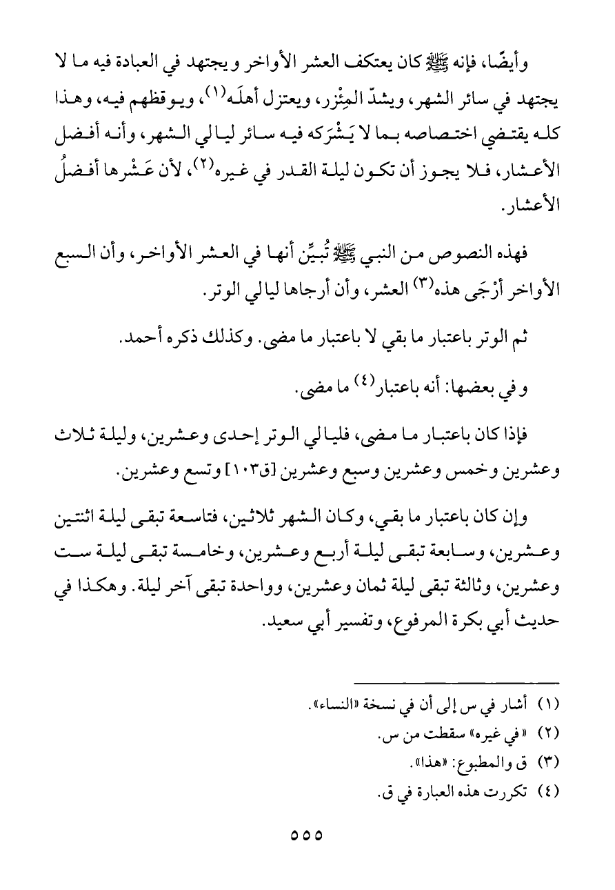 وأيضًا، فإنه - صلى الله عليه وسلم - كان يعتكف العشر الأواخر ويجتهد في العبادة فيه ما لا يجتهد في سائر الشهر، ويشدّ المِئْزر، ويعتزل أهلَه (¬١)، ويوقظهم فيه، وهذا كله يقتضي اختصاصه بما لا يَشْرَكه فيه سائر ليالي الشهر، وأنه أفضل الأعشار، فلا يجوز أن تكون ليلة القدر في غيره (¬٢)، لأن عَشْرها أفضلُ الأعشار.