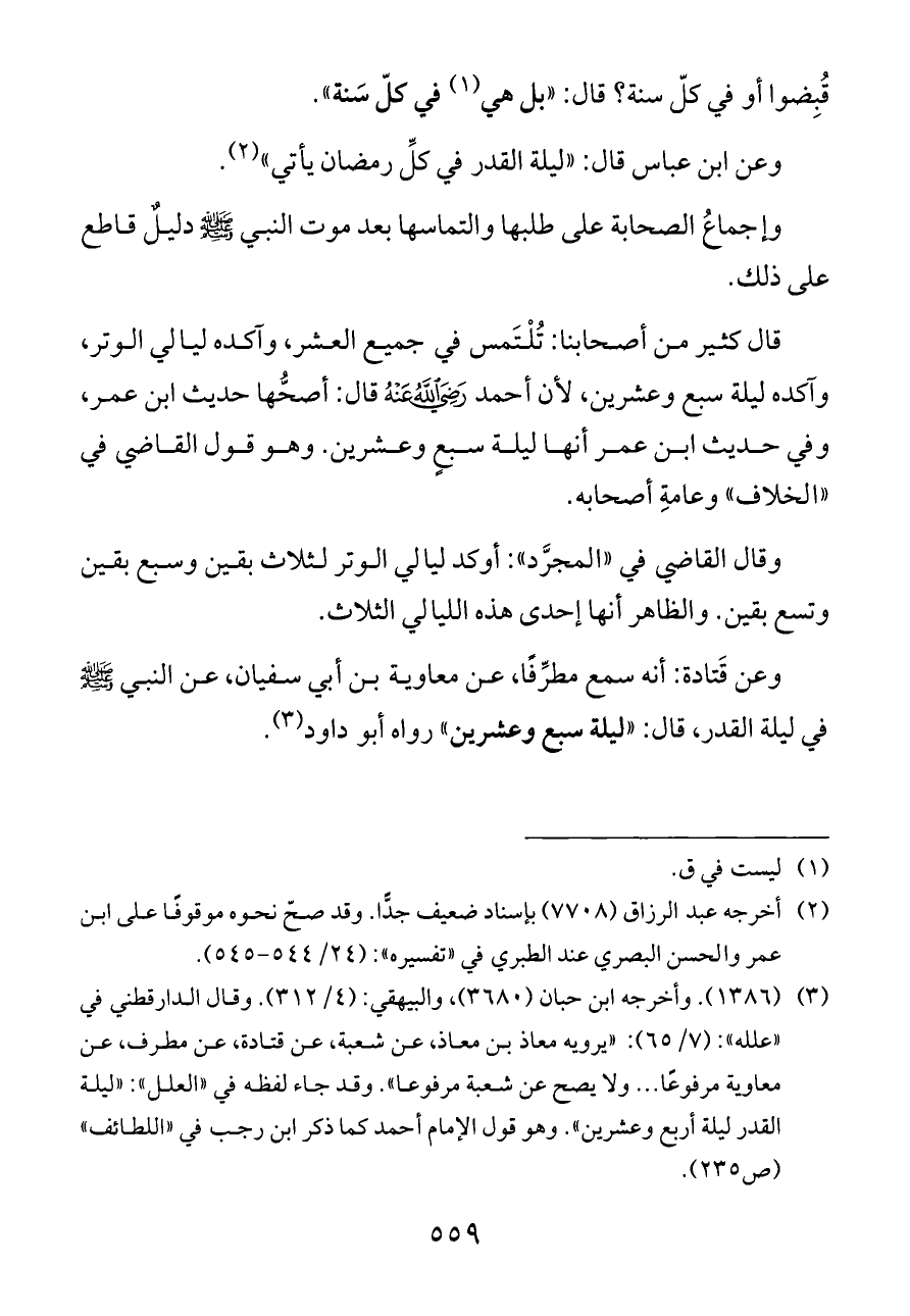 وعن قَتادة: أنه سمع مطرِّفًا، عن معاوية بن أبي سفيان، عن النبي - صلى الله عليه وسلم - في ليلة القدر، قال: «ليلة سبع وعشرين» رواه أبو داود (¬٣).