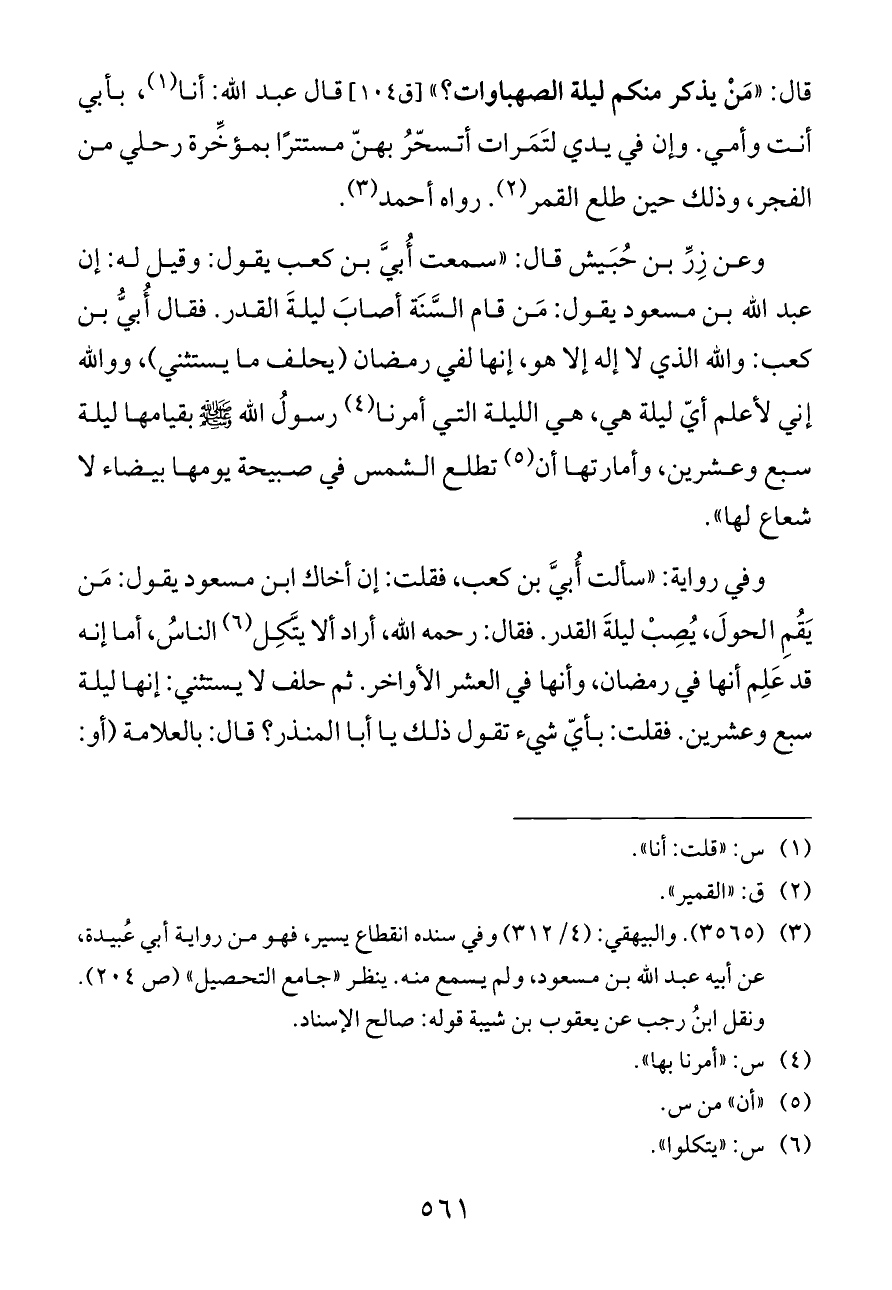 وعن زِرِّ بن حُبَيش قال: «سمعت أُبيَّ بن كعب يقول: وقيل له: إن عبد الله بن مسعود يقول: مَن قام السَّنَة أصابَ ليلةَ القدر. فقال أُبيُّ بن كعب: والله الذي لا إله إلا هو، إنها لفي رمضان (يحلف ما يستثني)، ووالله إني لأعلم أيّ ليلة هي، هي الليلة التي أمرنا (¬٤) رسولُ الله - صلى الله عليه وسلم - بقيامها ليلة سبع وعشرين، وأمارتها أن (¬٥) تطلع الشمس في صبيحة يومها بيضاء لا شعاع لها».
