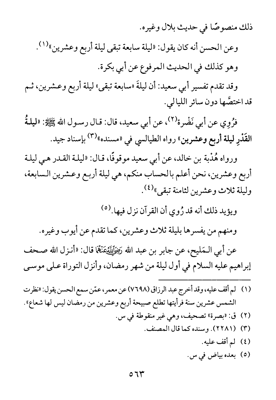 ورواه هُدْبة بن خالد، عن أبي سعيد موقوفًا، قال: «ليلة القدر هي ليلة أربع وعشرين، نحن أعلم بالحساب منكم، هي ليلة أربع وعشرين السابعة، وليلة ثلاث وعشرين لثامنة تبقى» (¬٤).