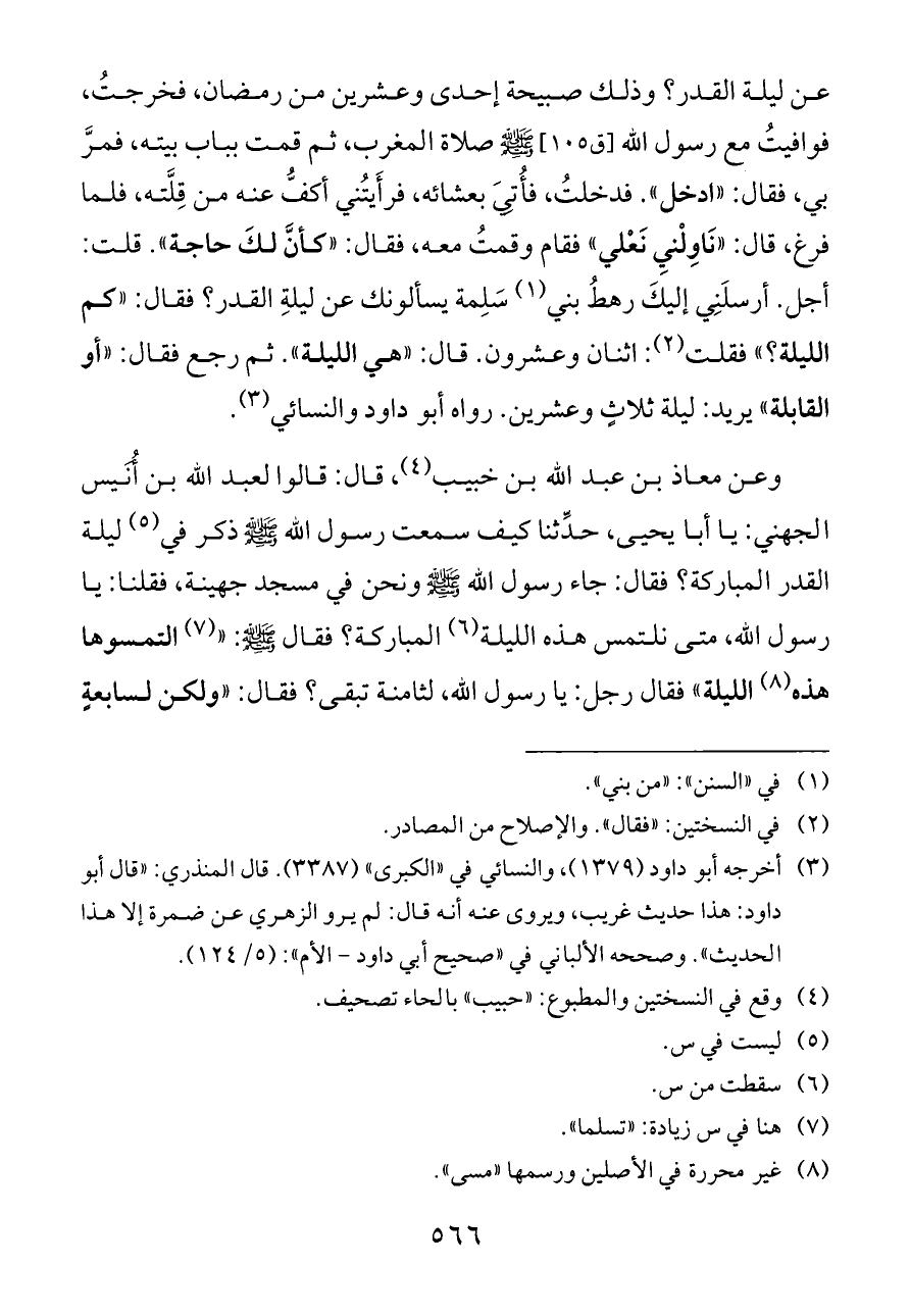 عن ليلة القدر؟ وذلك صبيحة إحدى وعشرين من رمضان، فخرجتُ، فوافيتُ مع رسول الله [ق ١٠٥]- صلى الله عليه وسلم - صلاة المغرب، ثم قمت بباب بيته، فمرَّ بي، فقال: «ادخل». فدخلتُ، فأُتِيَ بعشائه، فرأَيتُني أكفُّ عنه من قِلَّته، فلما فرغ، قال: «نَاوِلْنيِ نَعْلي» فقام وقمتُ معه، فقال: «كأنَّ لكَ حاجة». قلت: أجل. أرسلَنِي إليكَ رهطُ بني (¬١) سَلِمة يسألونك عن ليلةِ القدر؟ فقال: «كم الليلة؟» فقلت (¬٢): اثنان وعشرون. قال: «هي الليلة». ثم رجع فقال: «أو القابلة» يريد: ليلة ثلاثٍ وعشرين. رواه أبو داود والنسائي (¬٣).