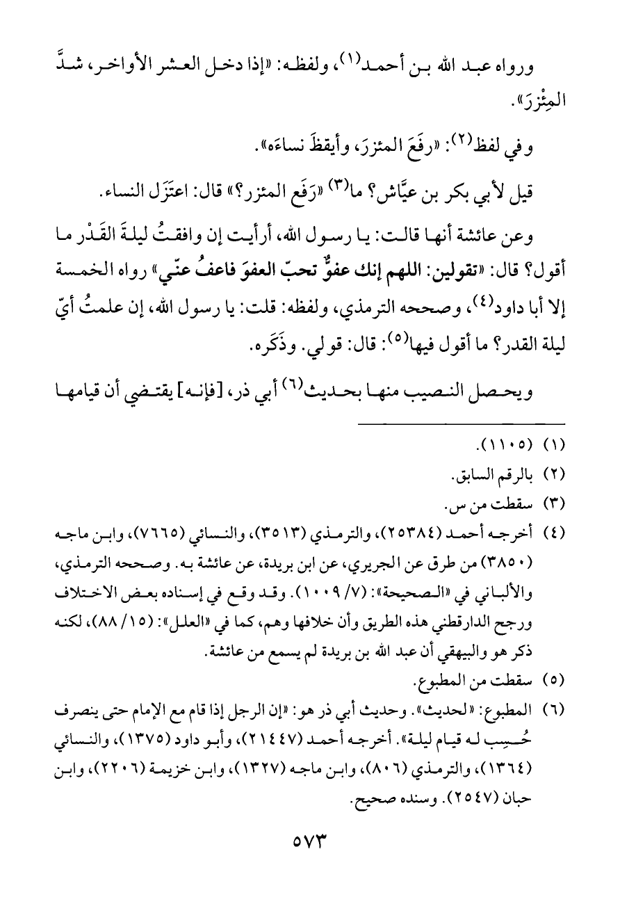 (¬٦) المطبوع: «لحديث». وحديث أبي ذر هو: «إن الرجل إذا قام مع الإمام حتى ينصرف حُسِب له قيام ليلة». أخرجه أحمد (٢١٤٤٧)، وأبو داود (١٣٧٥)، والنسائي (١٣٦٤)، والترمذي (٨٠٦)، وابن ماجه (١٣٢٧)، وابن خزيمة (٢٢٠٦)، وابن حبان (٢٥٤٧). وسنده صحيح.
