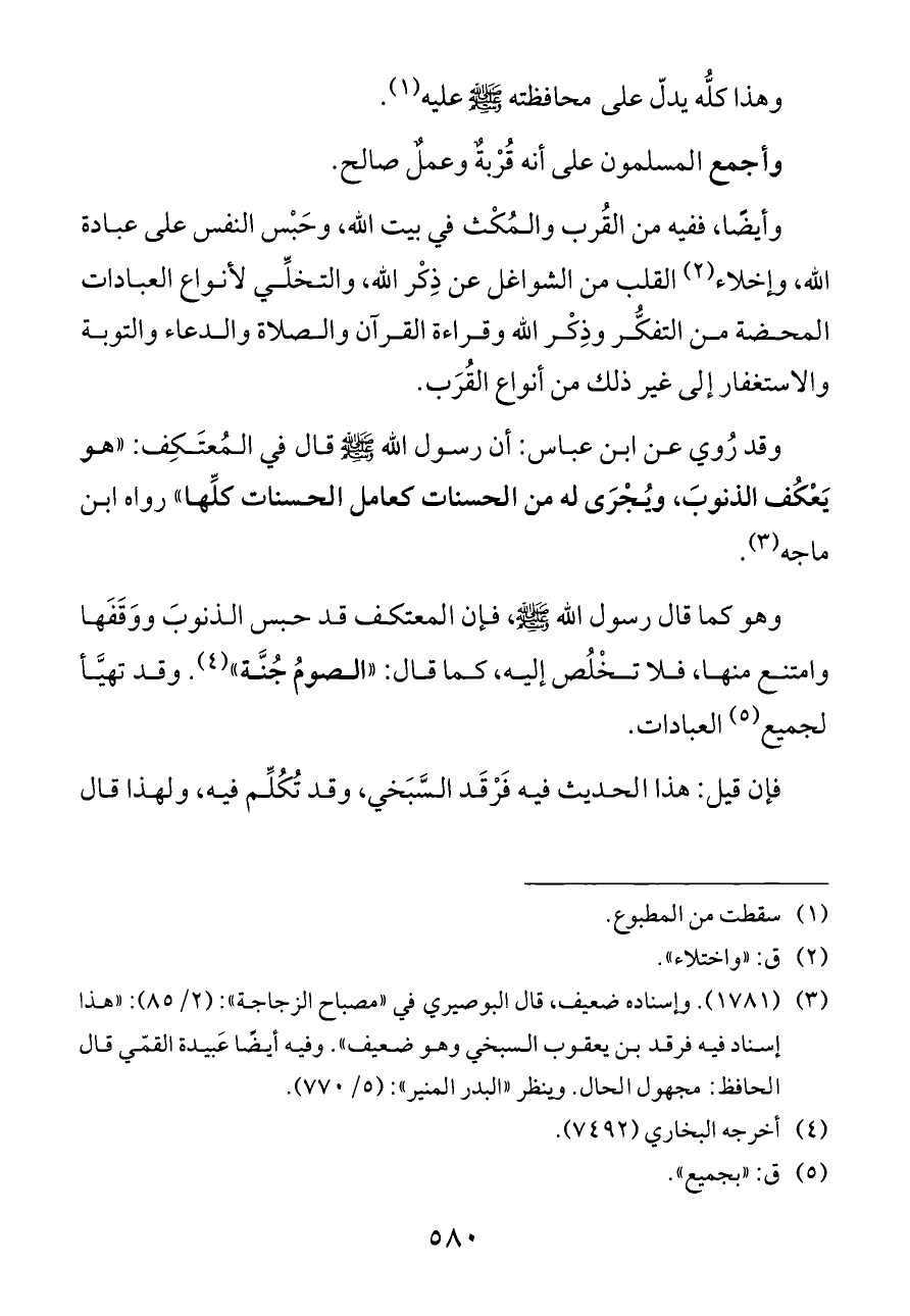 وقد رُوي عن ابن عباس: أن رسول الله - صلى الله عليه وسلم - قال في المُعتَكِف: «هو يَعْكُف الذنوبَ، ويُجْرَى له من الحسنات كعامل الحسنات كلِّها» رواه ابن ماجه (¬٣).