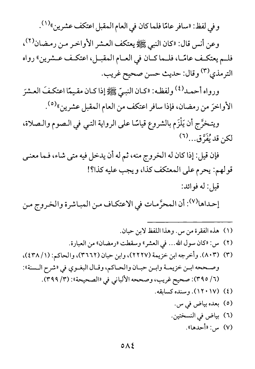 ورواه أحمد (¬٤) ولفظه: «كان النبيّ - صلى الله عليه وسلم - إذا كان مقيمًا اعتكفَ العشرَ الأواخرَ من رمضان، فإذا سافر اعتكف من العام المقبل عشرين» (¬٥).