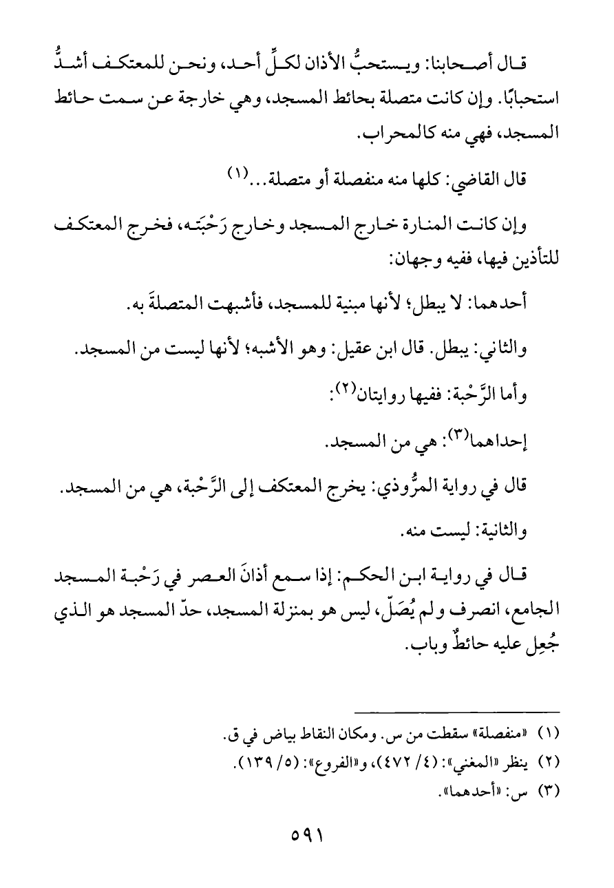 قال أصحابنا: ويستحبُّ الأذان لكلِّ أحد، ونحن للمعتكف أشدُّ استحبابًا. وإن كانت متصلة بحائط المسجد، وهي خارجة عن سمت حائط المسجد، فهي منه كالمحراب.