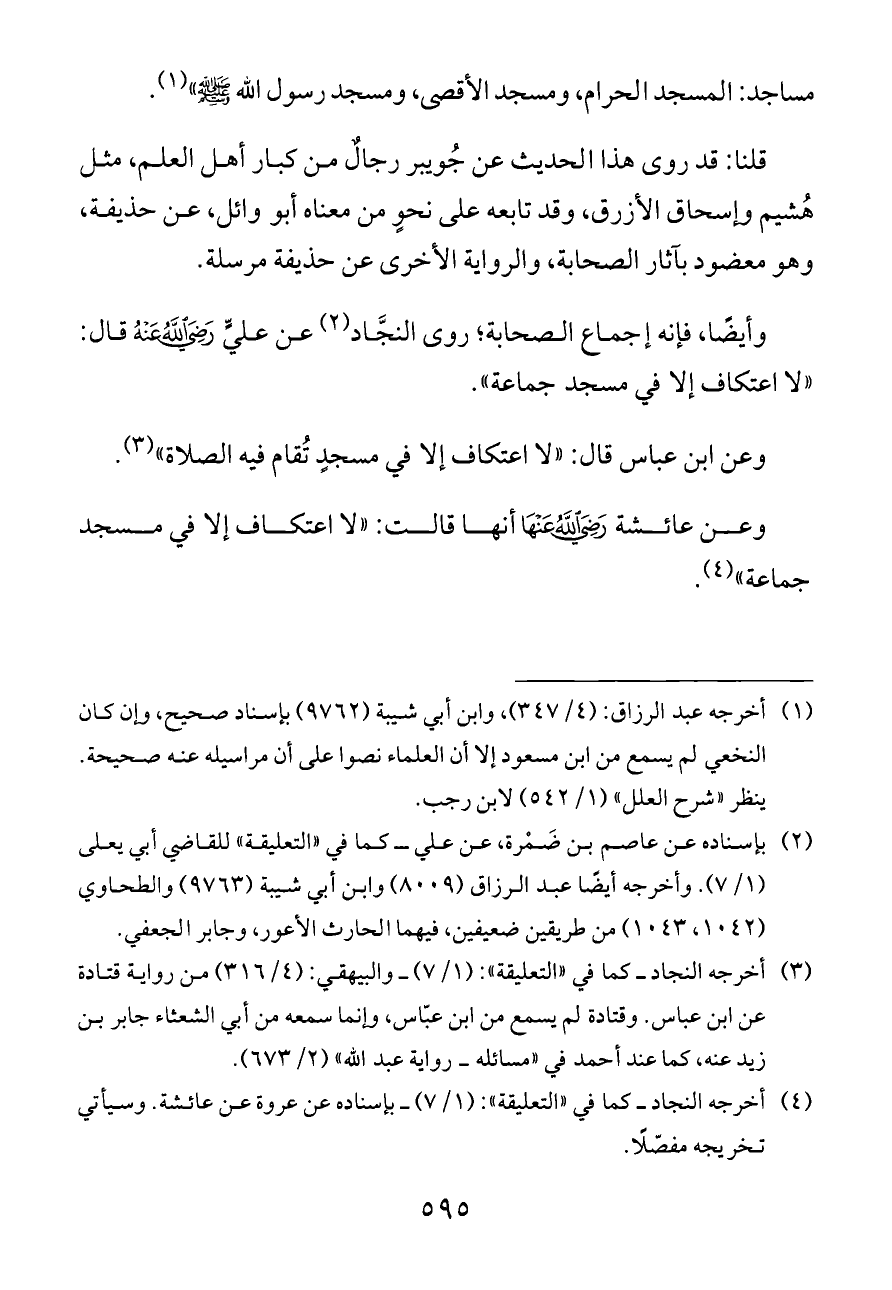 وعن ابن عباس قال: «لا اعتكاف إلا في مسجدٍ تُقام فيه الصلاة» (¬٣).