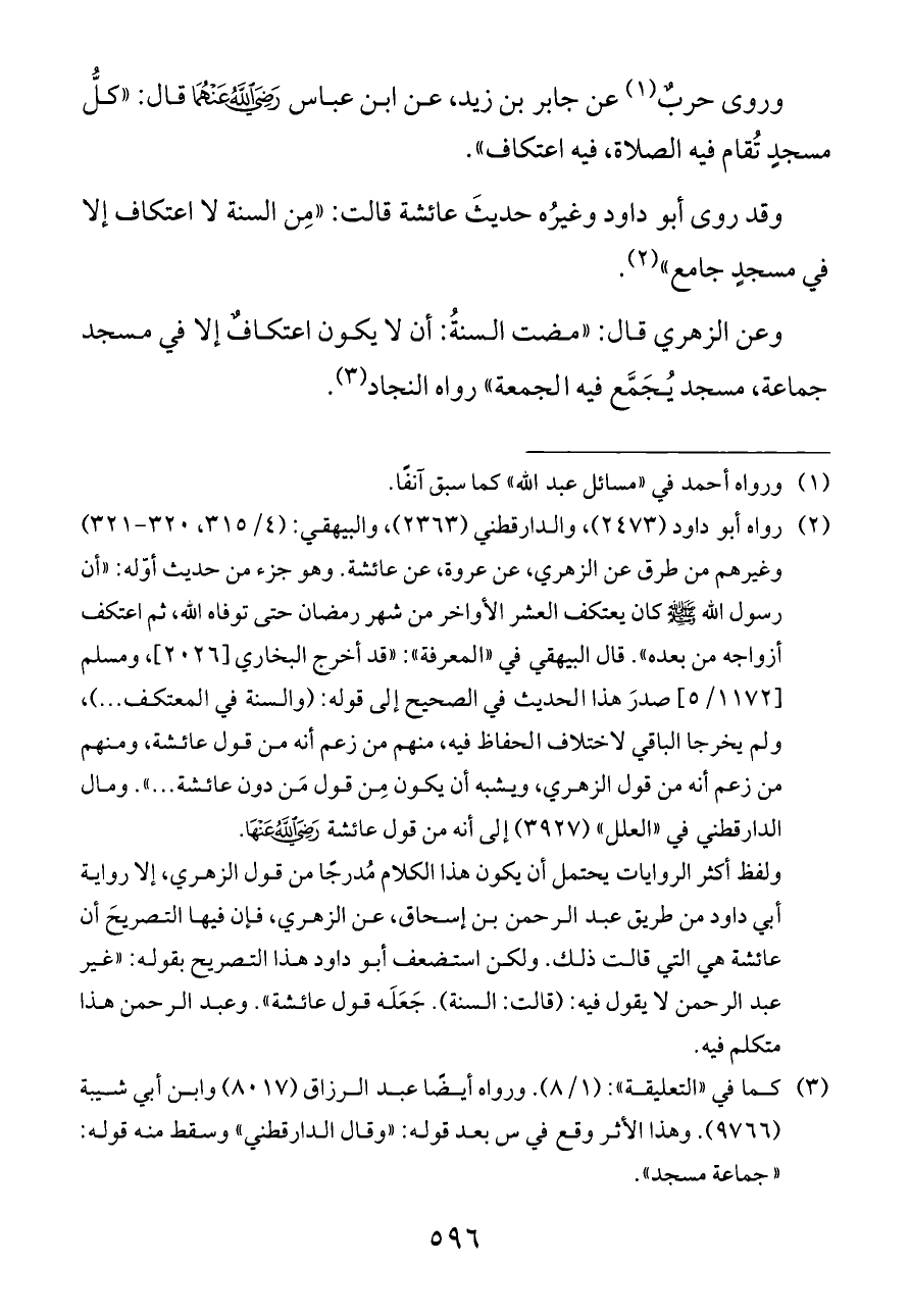 وعن الزهري قال: «مضت السنةُ: أن لا يكون اعتكافٌ إلا في مسجد جماعة، مسجد يُجَمَّع فيه الجمعة» رواه النجاد (¬٣).