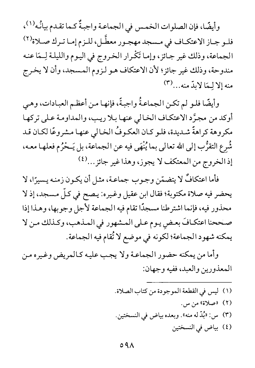 وأيضًا، فإن الصلوات الخمس في الجماعة واجبةٌ كما تقدم بيانُه (¬١)، فلو جاز الاعتكاف في مسجد مهجور معطَّل، للزم إما ترك صلاة (¬٢) الجماعة، وذلك غير جائز، وإما تَكْرار الخروج في اليوم والليلة لِمَا عنه مندوحة، وذلك غير جائز؛ لأن الاعتكاف هو لزوم المسجد، وأن لا يخرج منه إلا لِمَا لابدّ منه ... (¬٣)