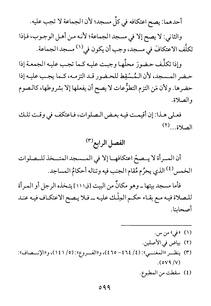 أن المرأة لا يصحّ اعتكافها إلا في المسجد المتخذ للصلوات الخمس (¬٤) الذي يحرُم مُقام الجنب فيه وتناله أحكامُ المساجد.