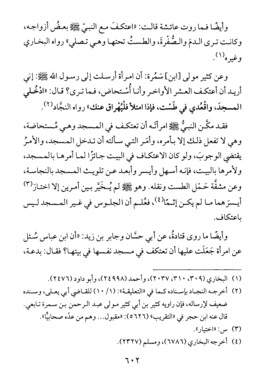 وأيضًا فما روت عائشة قالت: «اعتكفَ مع النبيّ - صلى الله عليه وسلم - بعضُ أزواجه، وكانت ترى الدمَ والصُّفْرةَ، والطستُ تحتها وهي تصلي» رواه البخاري وغيره (¬١).