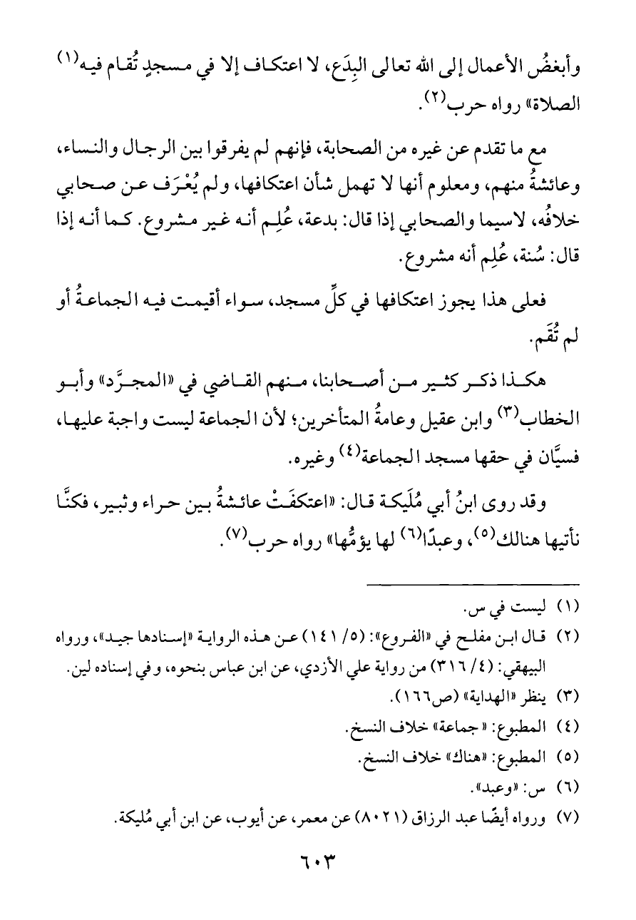 وقد روى ابنُ أبي مُلَيكة قال: «اعتكفَتْ عائشةُ بين حراء وثبير، فكنَّا نأتيها هنالك (¬٥)، وعبدًا (¬٦) لها يؤمُّها» رواه حرب (¬٧).