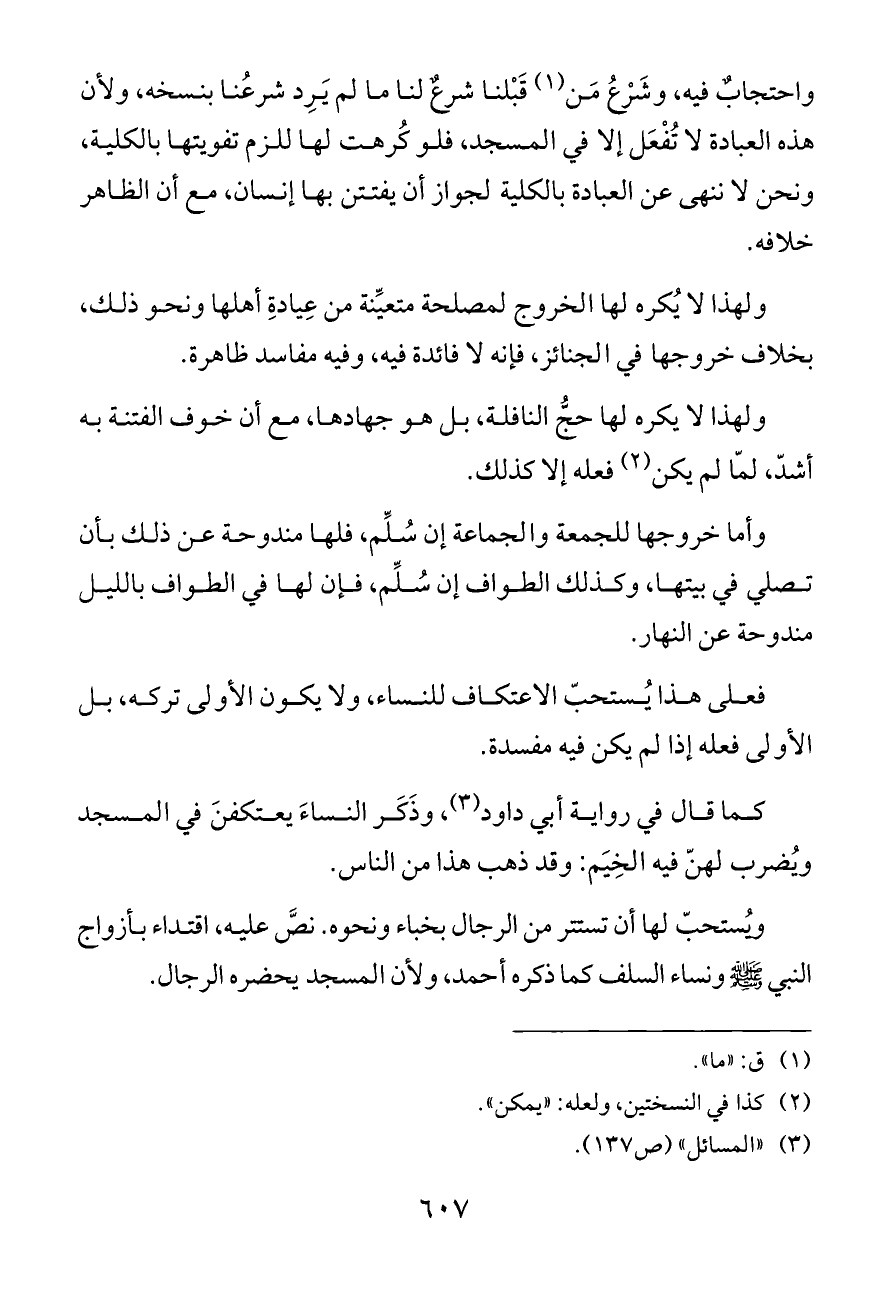 كما قال في رواية أبي داود (¬٣) , وذَكَر النساءَ يعتكفنَ في المسجد ويُضرب لهنّ فيه الخِيَم: وقد ذهب هذا من الناس.