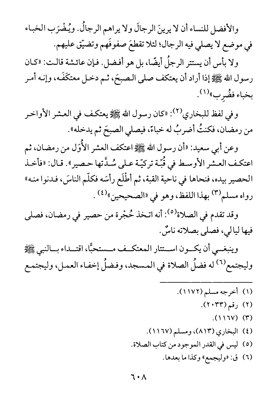 ولا بأس أن يستتر الرجلُ أيضًا، بل هو أفضل. فإن عائشة قالت: «كان رسول الله - صلى الله عليه وسلم - إذا أراد أن يعتكف صلى الصبحَ، ثم دخل معتكَفَه، وإنه أمر بخباء فضُرِب» (¬١).