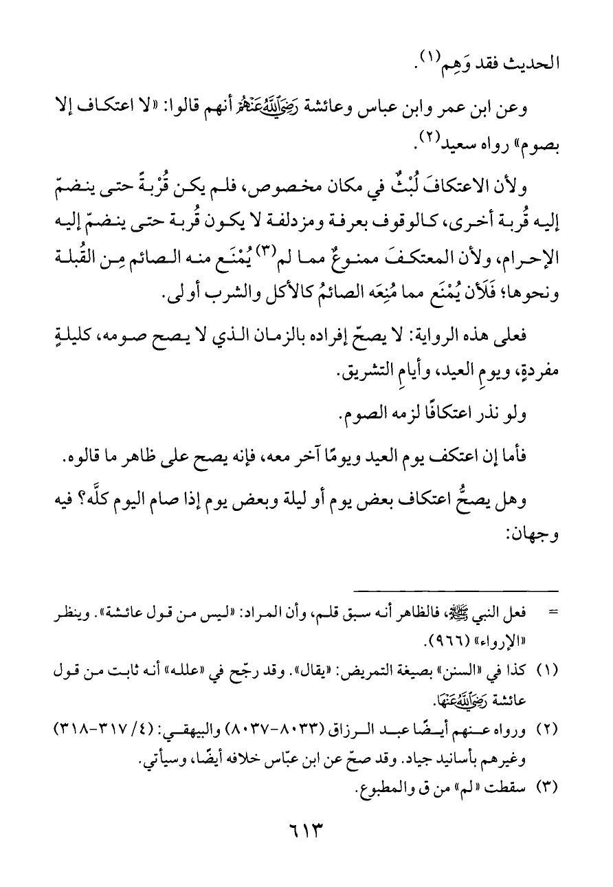 وعن ابن عمر وابن عباس وعائشة - رضي الله عنهم - أنهم قالوا: «لا اعتكاف إلا بصوم» رواه سعيد (¬٢).